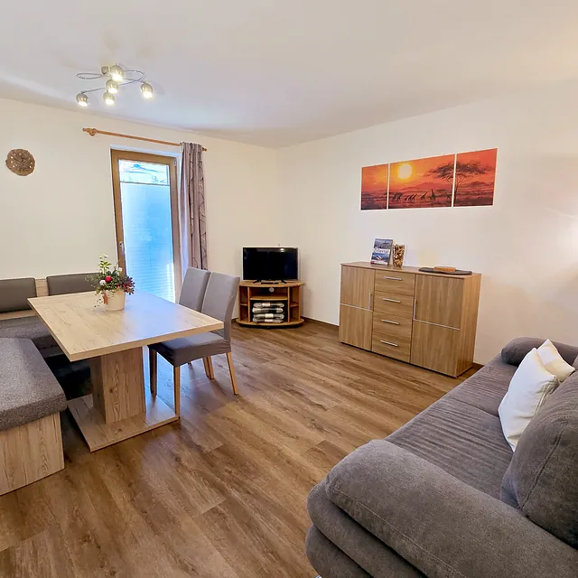 Das Wohnzimmer verfügt über Esstisch, Couch, SAT-TV, WLAN, Radio und CD-Player, einen Zugang auf den geräumigen Balkon sowie ein Zustellbett.
